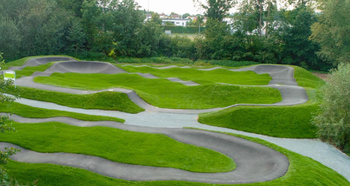 Die Zwischenbereiche der Anlage sollen mit Sport- und Spielrasen angelegt werden, damit sich die Anlage trotz der asphaltierten Fahrbahn ins grüne Landschaftsbild eingliedert.